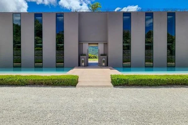 On the ground level the spectacular double volume main entrance boasts a balanced composition of water features and landscaped hedges. From here there is a seamless flow through massive glass sliding doors to the undercover terrace overlooking a landscaped formal garden, mountain and heated rim flow pool.