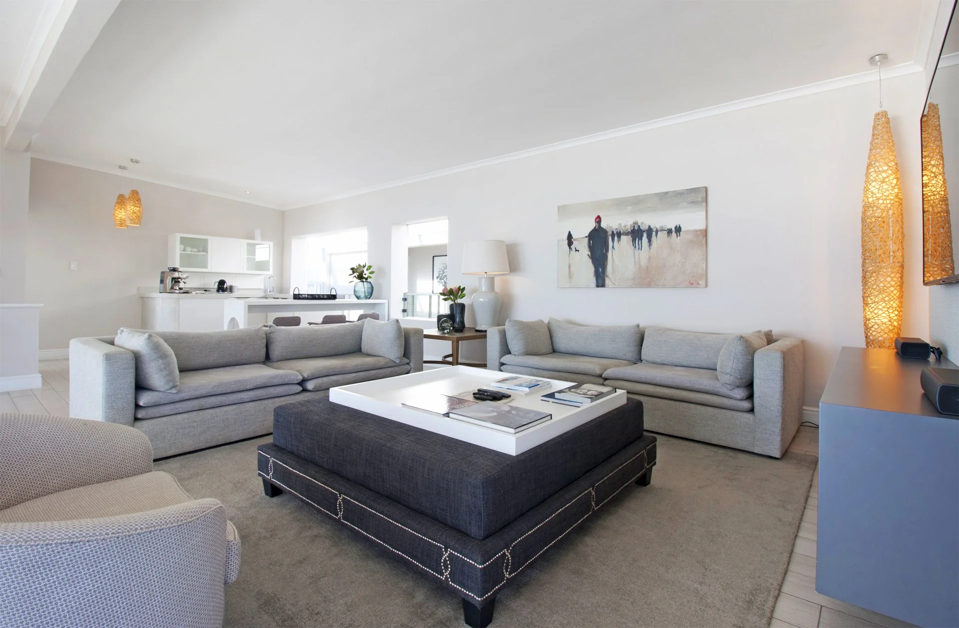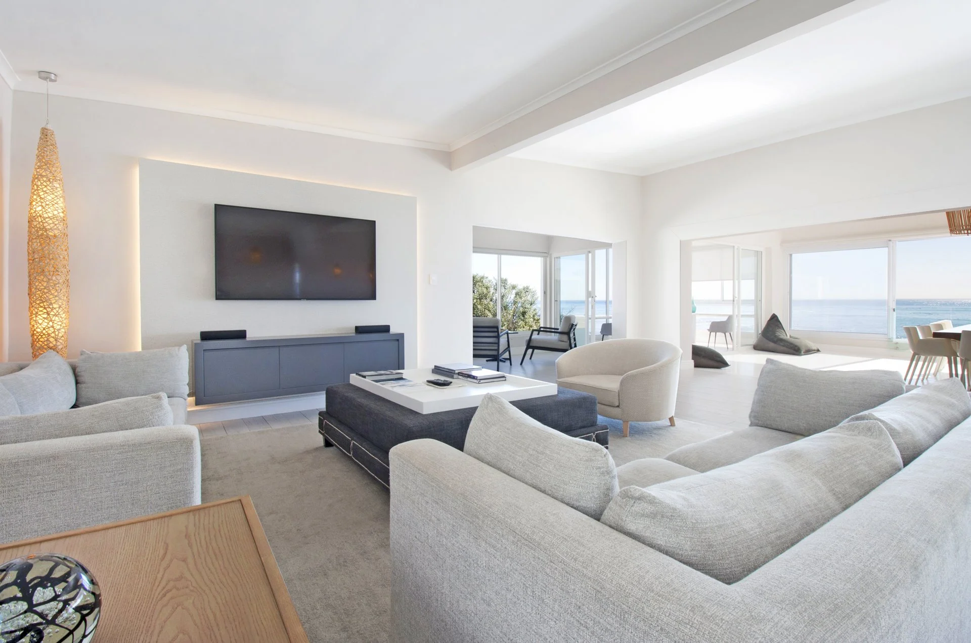 2 Comfortable Lounges: Relax and unwind in beautifully designed lounges. With tasteful decor and artwork, these spaces are perfect for gathering with loved ones, enjoying a movie night, or simply soaking in the coastal ambiance.